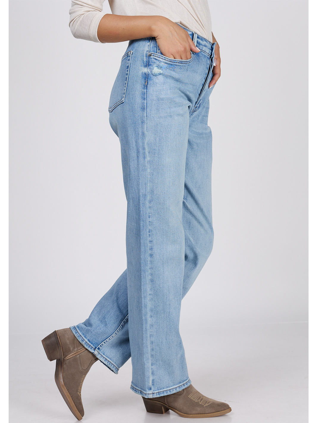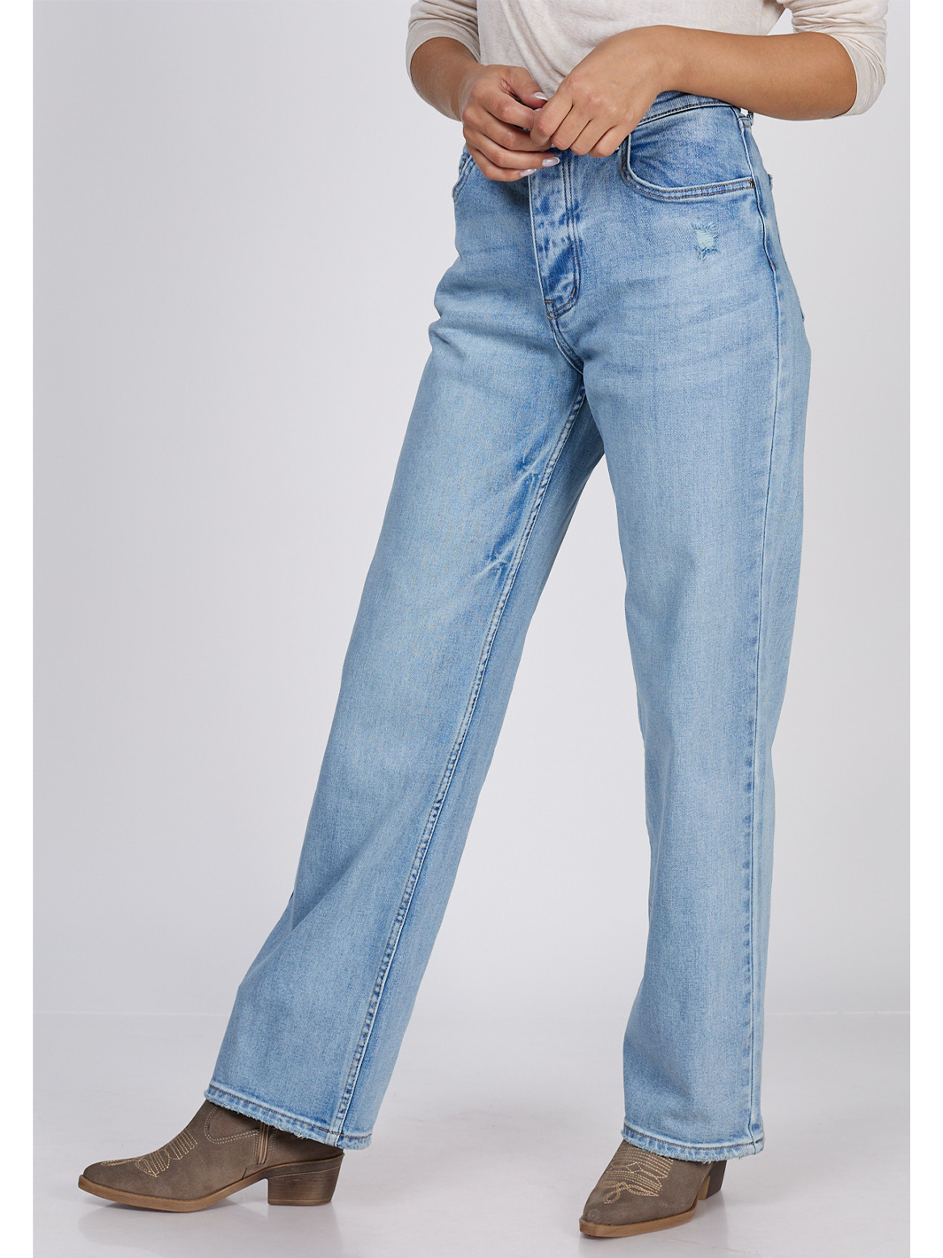 • Mid-blue clean wash with subtle distressing
