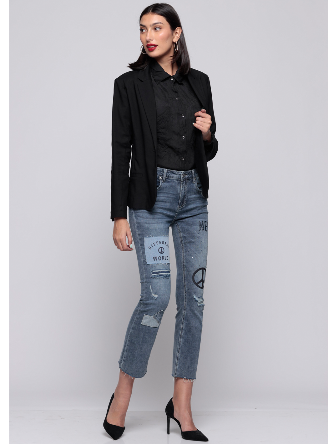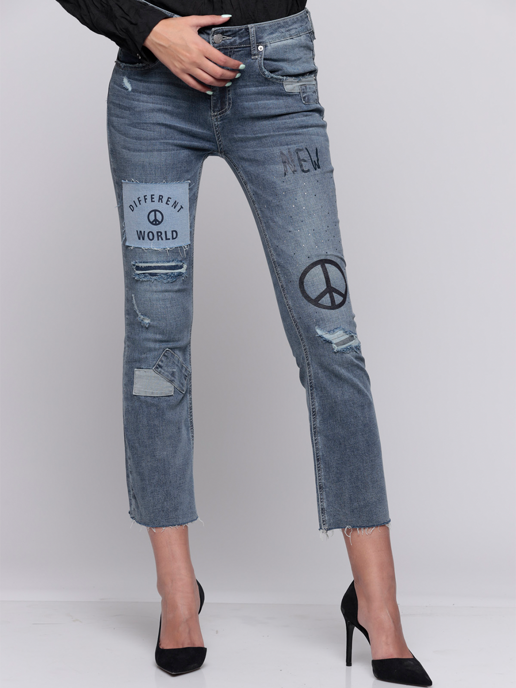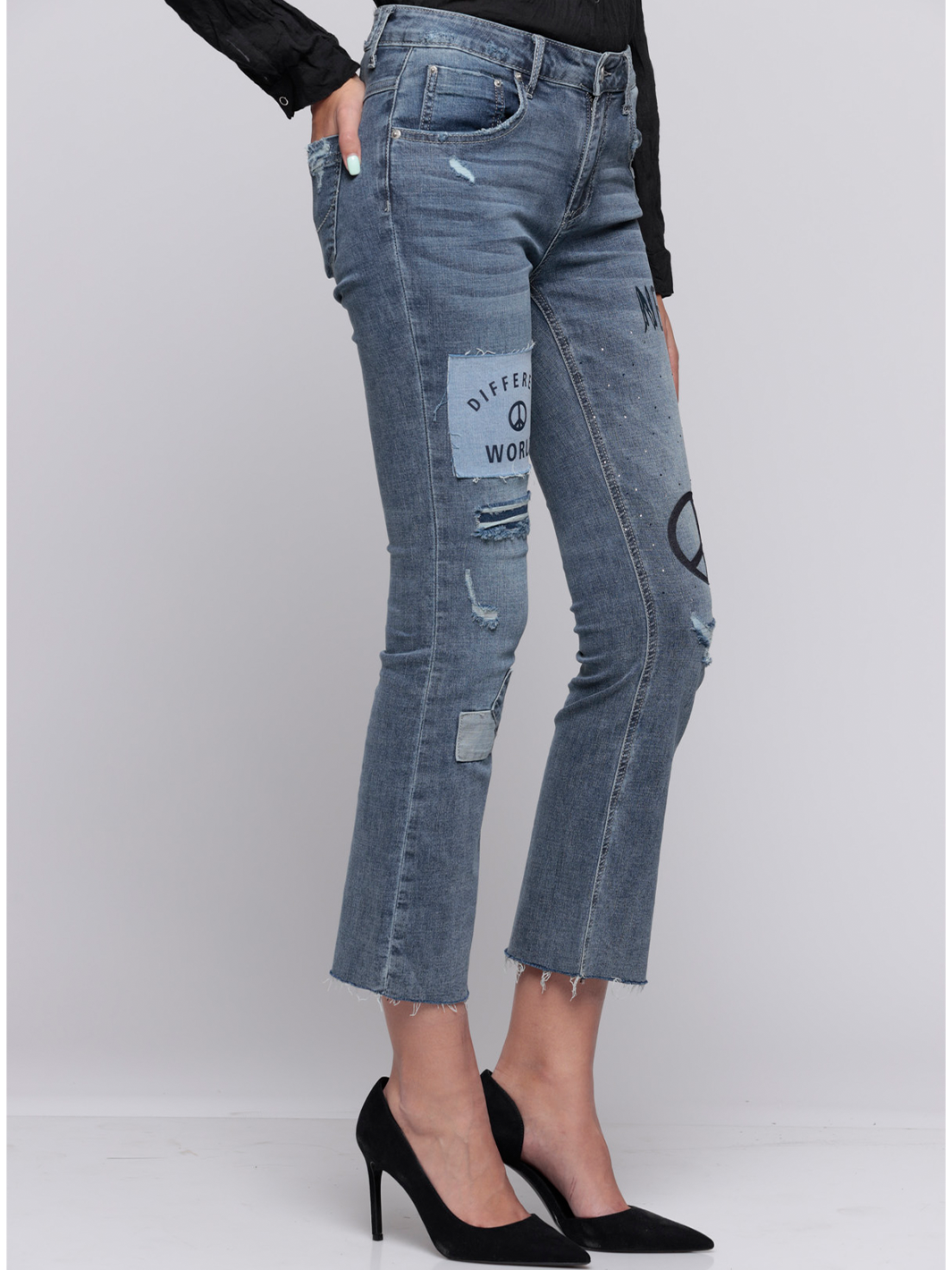 • Backed distressing and contrast patch detail