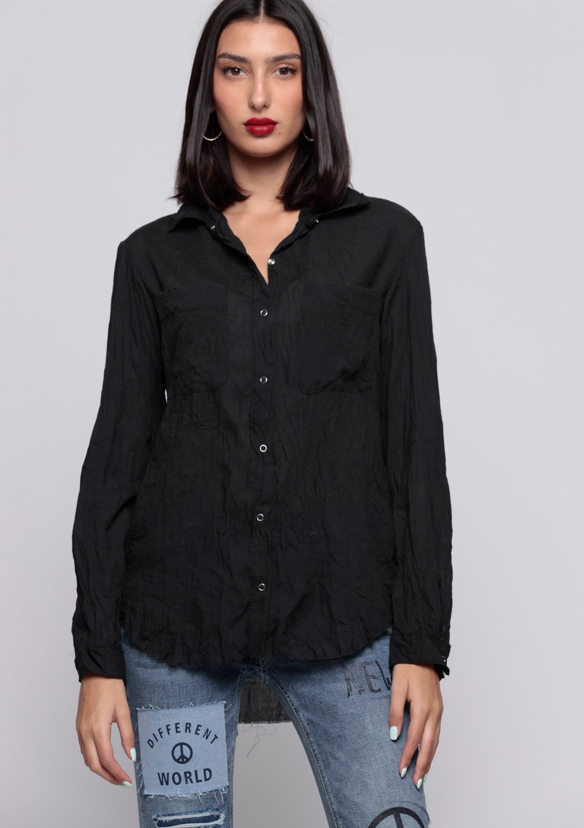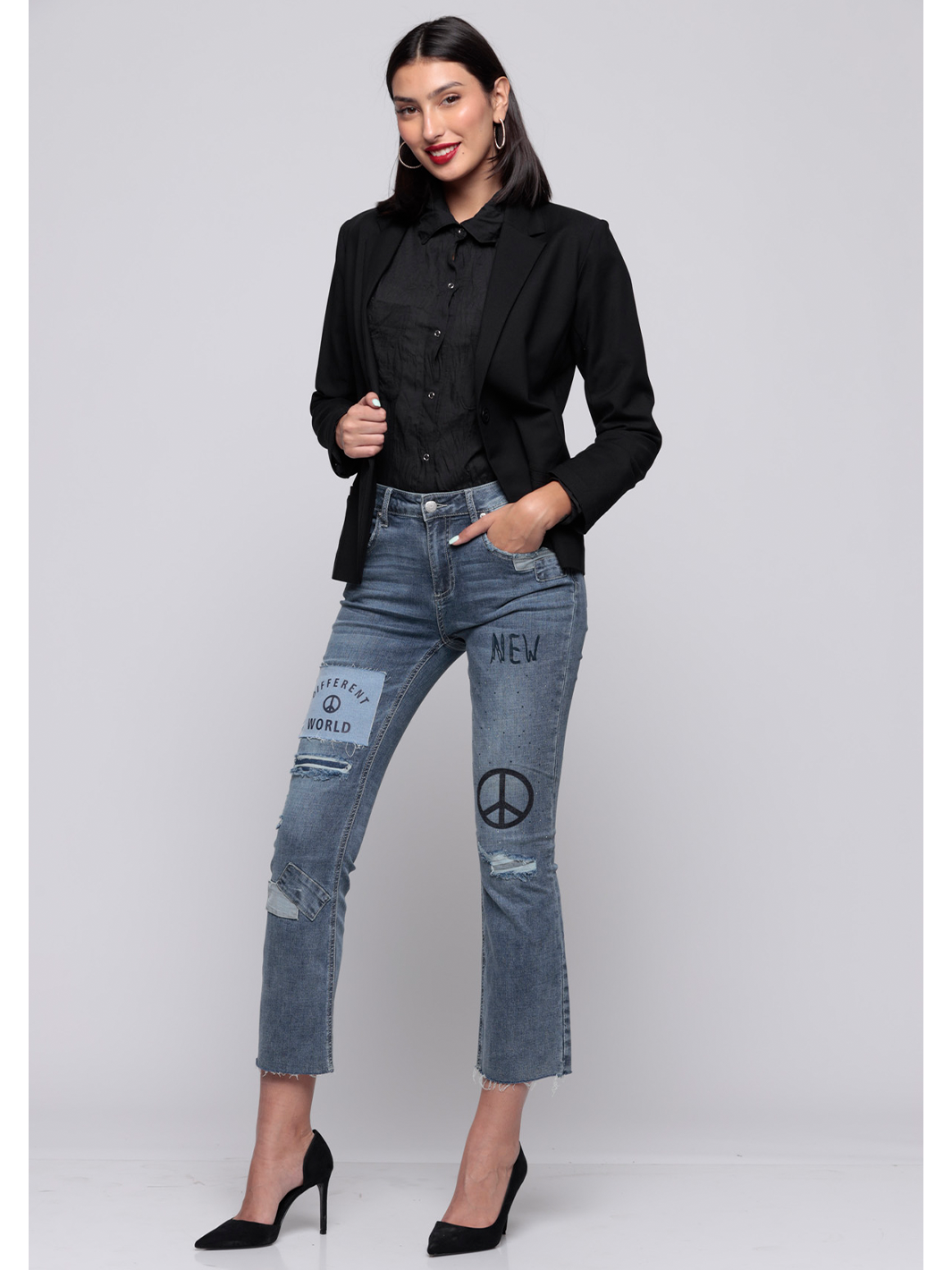 • Zip fly, five pockets, silver hardware