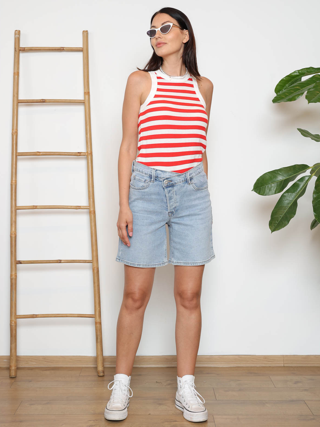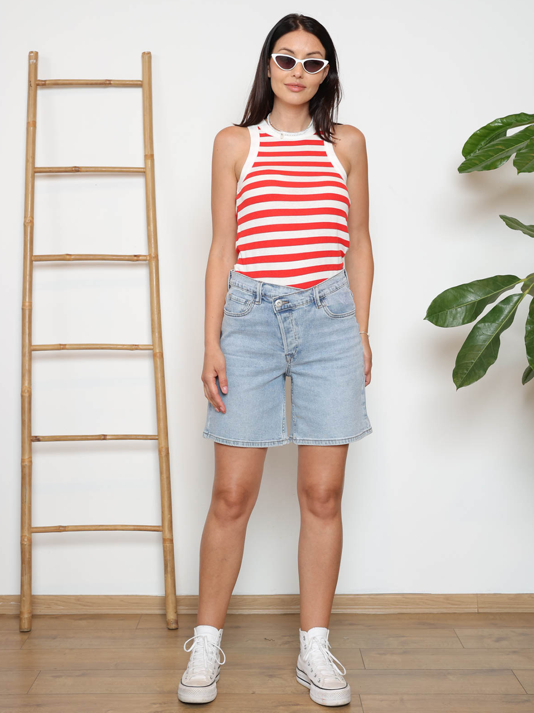 The New York Short brings a modern twist to classic denim. Designed with a crossover waistline and asymmetric front, it features a clean button fly that gives the style a flattering, elevated look.
