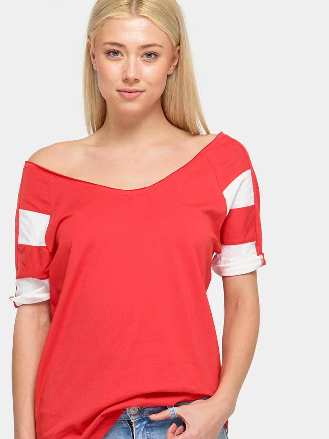 Crafted for everyday comfort with a touch of bold style, the Stripe Sleeve T-Shirt in red is a wardrobe essential you’ll reach for time and time again. Featuring sleek stripe detailing on the sleeves, this T-shirt adds a sporty edge to your casual look while maintaining effortless sophistication. Pair it with your favorite Bianco denim for weekend errands or layer it under a jacket for a polished, laid-back vibe.