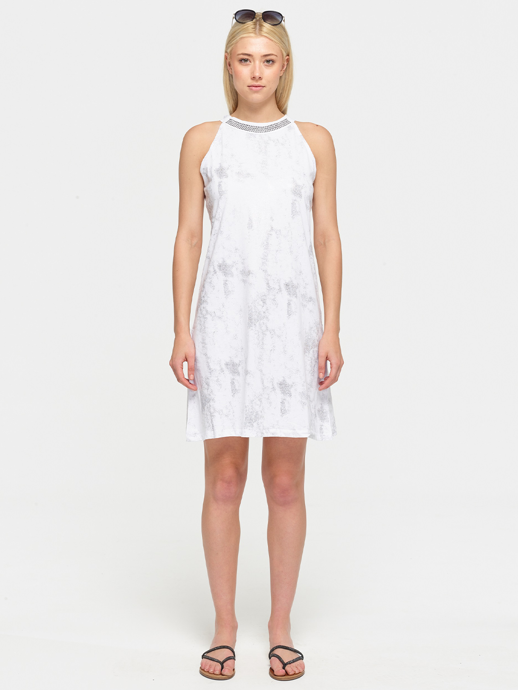 Crafted from 100% cotton in crisp white with a subtle silver print, it features a relaxed silhouette and a softly studded neckline that catches the light.